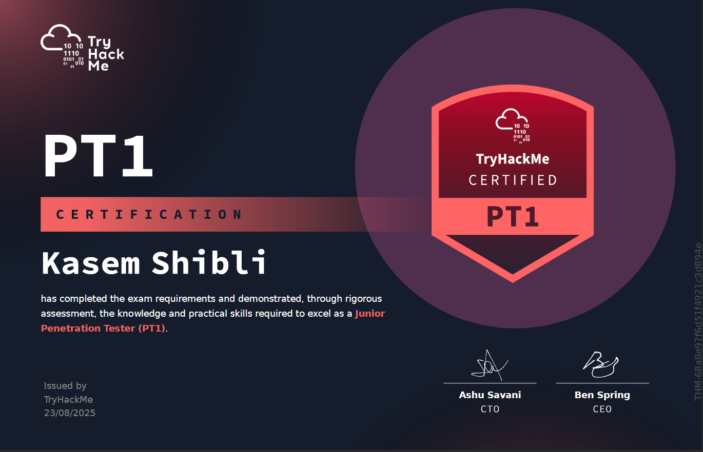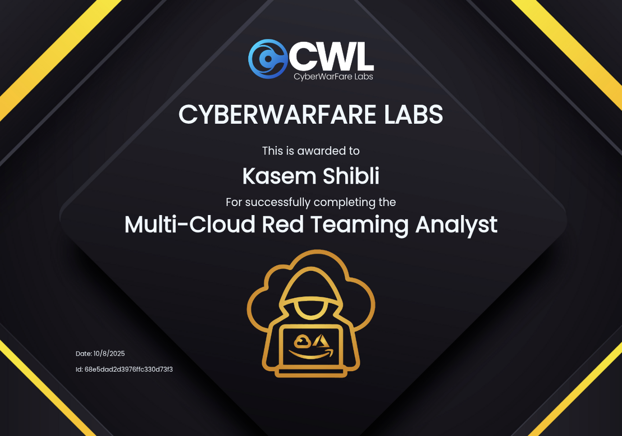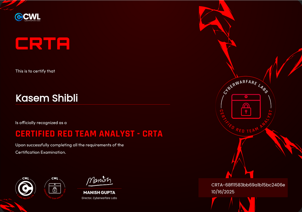 I'm Kasem Shibli, a 26-year-old Certified Ethical Hacker (CEH) Master, Certified Cybersecurity Professional, and holder of multiple advanced certifications including PNPT, eJPT, eCPPT, eWPT, and CRTP. With expertise in penetration testing, Active Directory exploitation, malware and exploit development, and reverse engineering, I specialize in uncovering and mitigating security vulnerabilities across networks, applications, and systems. I’m actively engaged in bug bounty programs, CTF competitions, and continuous learning in advanced red teaming techniques. Passionate about solving complex cybersecurity challenges, I’m driven to contribute to high-impact security projects and innovative defense strategies.