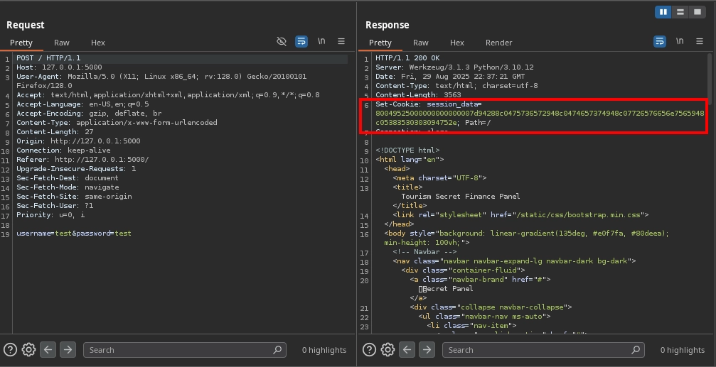 We don’t see much on the website itself, but checking our login request in Burp Suite, we can see the server setting an interesting cookie called session_data.